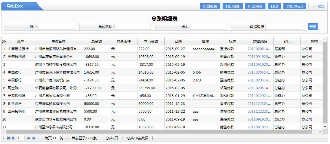 9、總賬明細,對于收付款的明細數(shù)據(jù)查詢,也可以對數(shù)據(jù)跟蹤,查詢到具體是那一個單據(jù)