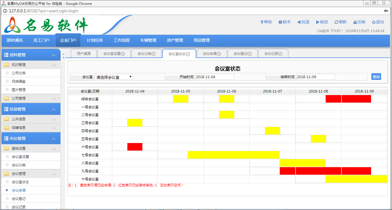 4、會(huì)議申請后在圖形顯示會(huì)議室狀態(tài)為黃色,還可以更改,調(diào)整
