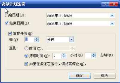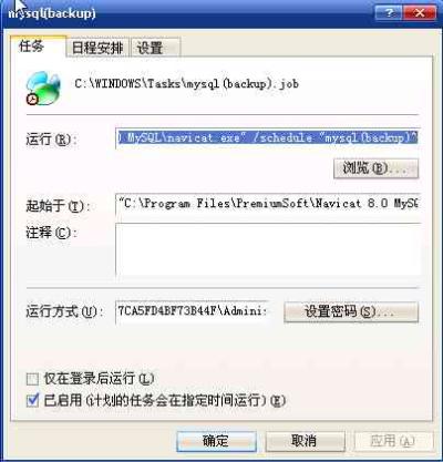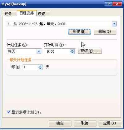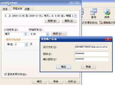 以上是我們對計劃任務(wù)進行的“任務(wù)管理”,從我們的設(shè)置上可以看出,我們是每天的9:00開始對MySQL進行備份,并且是每隔一分鐘進行一次備份,時間是從11月26號9點到11月30號的9點。 7.完成“任務(wù)計劃”后,我們點擊“確定”,這時會提示輸入管理員的密碼,默認不用輸入。