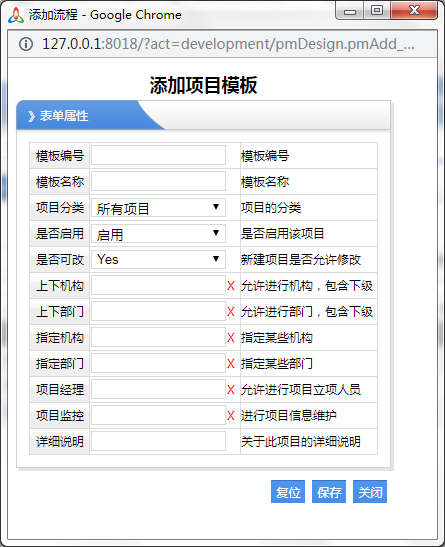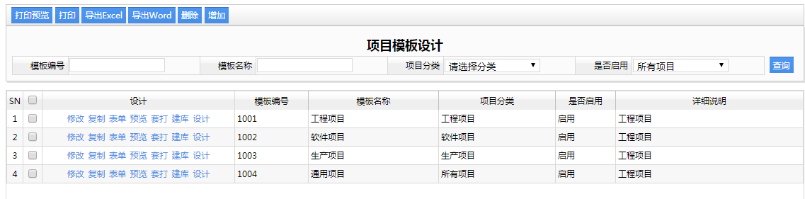 項(xiàng)目模板設(shè)計(jì) 項(xiàng)目模板設(shè)計(jì)在“系統(tǒng)管理”->“開(kāi)發(fā)平臺(tái)”->“流程設(shè)計(jì)”->“項(xiàng)目設(shè)計(jì)”  項(xiàng)目管理多種多樣,不能用單一的一種方式進(jìn)行統(tǒng)一的項(xiàng)目管理,比如說(shuō)房地產(chǎn)建房子,它是一種項(xiàng)目,裝修公司對(duì)房屋內(nèi)部的裝修,它也是一種項(xiàng)目,還比如說(shuō)做It的接到一個(gè)工程也是一個(gè)項(xiàng)目,所以說(shuō)項(xiàng)目種類很多,那么每一種項(xiàng)目,都有他自己獨(dú)特的特點(diǎn),所以說(shuō)我們要對(duì)每一個(gè)項(xiàng)目要進(jìn)行對(duì)他單獨(dú)進(jìn)行一個(gè)設(shè)置, 這里的模板,就是對(duì)每一個(gè)項(xiàng)目進(jìn)行了單獨(dú)的模板設(shè)置,比如說(shuō),他的模板的表單形式是怎么樣子?那么在項(xiàng)目過(guò)程中,每個(gè)節(jié)點(diǎn)是什么樣子?只要我們這邊設(shè)計(jì)好了,那么在項(xiàng)目管理里面,用戶使用起來(lái),就更加方便,就不用再去對(duì)每個(gè)項(xiàng)目進(jìn)行詳細(xì)的設(shè)置,再說(shuō)了,普通的用戶操作人員設(shè)置起來(lái)也可能沒(méi)有那么順心,培訓(xùn)起來(lái)也比較復(fù)雜,所以說(shuō)我們有系統(tǒng)管理員設(shè)置好模板以后用戶直接進(jìn)行使用就更加方便了! 1、首先要建立一個(gè)模板,成為項(xiàng)目管理的一個(gè)導(dǎo)火線