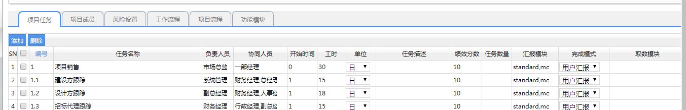A、編號(hào):就是項(xiàng)目任務(wù)的編號(hào),如果點(diǎn)擊編號(hào),會(huì)自動(dòng)生成序數(shù)1、2、3……; 當(dāng)然也可以手工自己編輯,如果是下級(jí)任務(wù)的話,可以用點(diǎn)號(hào)來(lái)分開(kāi),如1、1.1、1.2、…….; B、任務(wù)名稱:是用來(lái)描述該任務(wù)的簡(jiǎn)單描述,字?jǐn)?shù)不要太多,能表達(dá)意思就可以了 C、負(fù)責(zé)人:表示該任務(wù)是由哪個(gè)人來(lái)進(jìn)行負(fù)責(zé)的,在任務(wù)管理過(guò)程中,那么負(fù)責(zé)人進(jìn)來(lái)就可以進(jìn)行匯報(bào)該任務(wù)的具體完成情況以及實(shí)施進(jìn)度 D、協(xié)同人員:表示完成該任務(wù),除了主要負(fù)責(zé)人,還有可能其他人員進(jìn)行來(lái)參與,協(xié)同人員也可以進(jìn)行任務(wù)匯報(bào) E、開(kāi)始時(shí)間,工時(shí),時(shí)間單位:這幾個(gè)是聯(lián)合來(lái)處理的,因?yàn)檫@里是模板設(shè)計(jì),不能以具體的時(shí)間來(lái)定,這里的開(kāi)始時(shí)間,是相對(duì)于該項(xiàng)目的立項(xiàng)時(shí)間,比如說(shuō):開(kāi)始時(shí)間為0,公式為10,時(shí)間單位為日,那么項(xiàng)目立項(xiàng)時(shí)間2019-09-01,那么該任務(wù)的開(kāi)始時(shí)間2019-09-01,工期為10天,那么該任務(wù)的結(jié)束時(shí)間就是2019-09-10,當(dāng)然根據(jù)這個(gè)時(shí)間單位的不同,計(jì)算時(shí)間也是不同的,計(jì)算方法是一樣的。 F、任務(wù)描述:就是描述該任務(wù)的詳細(xì)說(shuō)明,補(bǔ)充說(shuō)明,一些細(xì)節(jié)說(shuō)明了,那么在項(xiàng)目管理過(guò)程中也可以看到該描述 H、績(jī)效分?jǐn)?shù):可以給這個(gè)項(xiàng)目完成后打了一個(gè)分?jǐn)?shù),也就是完成該任務(wù)所得到的績(jī)效考核分?jǐn)?shù) I、任務(wù)數(shù):表示完成此任務(wù)需要多少個(gè)任務(wù)數(shù)?這樣就可以計(jì)算出該任務(wù)完成了多少,也就是一個(gè)任務(wù)的一個(gè)完成數(shù)量的標(biāo)準(zhǔn),跟后面的取數(shù)模塊配合使用,從而計(jì)算出該任務(wù)的完成百分比 J、匯報(bào)模塊,匯報(bào)模塊,取數(shù)模塊:匯報(bào)模塊有三種方式,第1種是用戶匯報(bào),第2種是調(diào)用模塊,第3種是從下級(jí)任務(wù)來(lái)計(jì)算他的總進(jìn)度 默認(rèn)為第1種用戶匯報(bào),其匯報(bào)模塊:standard,moduleName=pm_admin_huibao&twoSubModule=&threeMenu=pm_admin_huibao&openWindow=Yes; 也就是調(diào)用項(xiàng)目管理中的標(biāo)準(zhǔn)匯報(bào)模塊