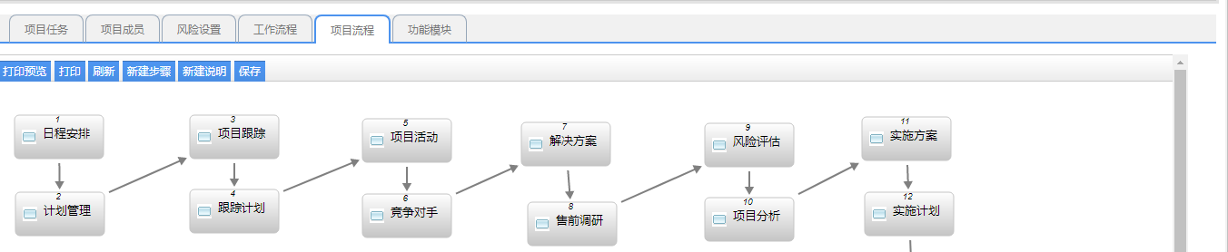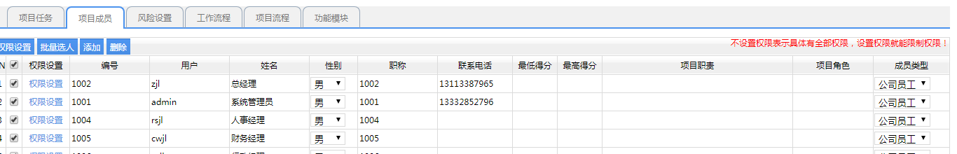 A、成員類型:分為公司員工和外部人員,公司員工為可以直接雙擊,或者批量選擇,就可以選擇系統(tǒng)對(duì)應(yīng)的人員資料了,如果是外部人員,就可以直接填寫(xiě)相關(guān)的姓名及聯(lián)系方式 B、最高分和最低分:該人員在該項(xiàng)目中可以得到的分?jǐn)?shù),就是績(jī)效考核所得的分?jǐn)?shù),最高分就是最高能得到的分?jǐn)?shù),最低分是至少能得到的分?jǐn)?shù) C、權(quán)限設(shè)置:權(quán)限設(shè)置可以單獨(dú)對(duì)某個(gè)用戶權(quán)限設(shè)置,也可以對(duì)多個(gè)用戶權(quán)限一起設(shè)置,如果設(shè)置了權(quán)限,就會(huì)按設(shè)置的權(quán)限進(jìn)行訪問(wèn),如果沒(méi)有設(shè)置權(quán)限,表示有所有的權(quán)限。這樣在用戶使用過(guò)程中,就避免復(fù)雜的操作 D、這里設(shè)置的項(xiàng)目成員,那么在項(xiàng)目起草的時(shí)候,就會(huì)自動(dòng)帶出這些項(xiàng)目成員,在項(xiàng)目管理過(guò)程中,項(xiàng)目立項(xiàng)的時(shí)候,操作起來(lái)就非常方便 3、風(fēng)險(xiǎn)設(shè)置: 風(fēng)險(xiǎn)設(shè)置表示項(xiàng)目在進(jìn)展過(guò)程中,某些信息達(dá)到一定程度,就可能產(chǎn)生風(fēng)險(xiǎn),這樣就可以預(yù)警該項(xiàng)目是有風(fēng)險(xiǎn)的時(shí)候,那么這樣的話,就可以讓項(xiàng)目管理者就可以清楚的看到該項(xiàng)目已經(jīng)出現(xiàn)了風(fēng)險(xiǎn),那么就可以采取相關(guān)的風(fēng)險(xiǎn)控制措施,來(lái)避免風(fēng)險(xiǎn)的持續(xù)發(fā)展 這里需要定義,在/app_lib/module/allModule/pmGetSystem.php進(jìn)行定義,如:fengxianSum,user_project_cost_admin,jine_sum,1,project_name_number,project_name_number 如果想定義自己想要的需求,也可以在這里面進(jìn)行定義,寫(xiě)一個(gè)函數(shù)就可以了 4、工作流程 在項(xiàng)目管理過(guò)程中,我們需要走工作流程進(jìn)行審核審批的單據(jù),我們可以把流程添加進(jìn)來(lái),然后在項(xiàng)目過(guò)程管理中,可以直接在工作流程里面直接發(fā)起,那么這樣就方便了用戶的操作