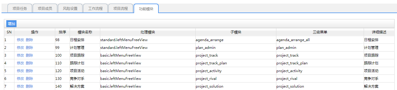 6、功能模塊 功能模塊主要是來(lái)設(shè)置該項(xiàng)目需要設(shè)置到哪些功能模塊的使用,那么設(shè)置好了以后,在項(xiàng)目管理項(xiàng)目中心里面要使用該功能模塊的話,就可以直接使用,這樣的話大大增加了用戶的操作的方便性,點(diǎn)擊添加就可以打開(kāi)如下: