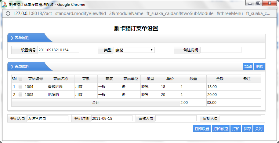 9、刷卡預(yù)訂菜單設(shè)置:主要是針對于公司的保安人員,清潔工,他們不怎么會使用微信訂餐,那么他們用員工卡,進(jìn)行刷卡訂餐,因為刷卡只刷一下就訂餐,不知道訂什么餐,那么我們在這里就設(shè)置默認(rèn)訂餐的菜單,方便刷卡進(jìn)行訂餐,如下圖所示