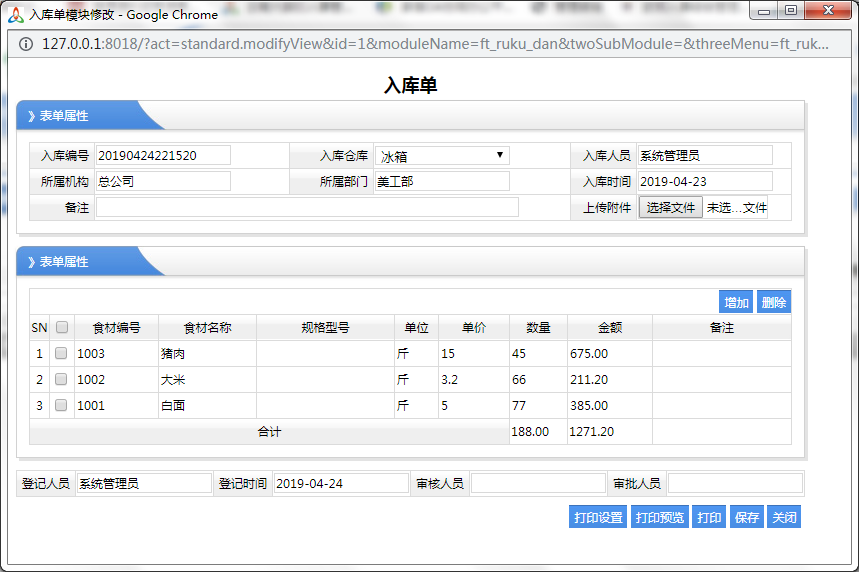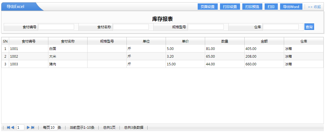 采購主題:主要說明采購的大致內(nèi)容,方便查詢,表示來根據(jù)采購主題,就能看出這個采購單的主要內(nèi)容 采購人員默認(rèn)為自己,采購時間默認(rèn)為當(dāng)天,如果還需要其他的說明,可以通過附件上傳 下面列表表示采購單,采購了哪些食品的明細(xì),是采購單的主要內(nèi)容,點擊空白框,就會彈出選擇基礎(chǔ)資料設(shè)置的食材管理,然后我們選擇幾個要采購的食材,那么這幾個食材就會自動調(diào)到這里面來,然后修改一下數(shù)量,單價及金額,就可以了 三、倉庫管理 1、采購入庫:采購入庫可以是直接入庫,也可以是來自于采購單,進(jìn)行入庫,其操作是非常簡單,跟采購管理是一樣的,然后按表單的內(nèi)容填寫就可以了  選擇好入庫倉庫,入庫單一旦保存,那么對應(yīng)的石材編號的,該倉庫的庫存數(shù)量會增加相應(yīng)的入庫數(shù)量 2、領(lǐng)用單 零用單主要是用于廚師,要進(jìn)行做菜,然后在材料倉庫去領(lǐng)料,那么領(lǐng)料表示庫存減少,這樣的一個操作  選擇好零用的倉庫,選擇好你用的食材,一旦保存,那么該倉庫對應(yīng)的食材的庫存數(shù)量會減少相應(yīng)的領(lǐng)用的數(shù)量 3、退回單 退回單也就是領(lǐng)用單,沒有用完,然后再退回到倉庫,也相當(dāng)于是一個入庫的操作