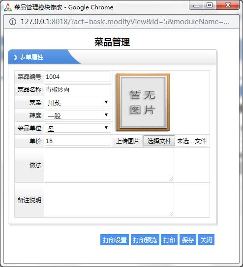 計劃編號:自動生成編號 計劃名稱:表示該計劃是什么餐別,如早餐,中餐,晚餐。 計劃時間:表示計劃時間 菜單時間:星期一到星期日 ,每月幾號,溝選那個日期就是那一天的用餐,如果星期一,每周星期一,依次類推,如果是每月幾號,表示每一個月都是這天進(jìn)行的菜單,總之這里的日期表示周期有的日期 具體日期:只表示一次,具體是指那一天,如2018-08-08表示2018年8月8號這天安排的菜單 用餐類型:表示早餐,午餐,晚餐,夜宵等,選擇,可以是多選,也可以是單選 列表屬性:表示有那些菜單,可以進(jìn)行多選,表示該天能吃到的餐,以及該菜單的價格 進(jìn)行了菜品計劃設(shè)計以后,以后每天每餐的菜單都是按照上面設(shè)計的,那么這樣廚房廚師做菜,就會按照這樣的菜單進(jìn)行做菜,也不會做別的菜,那么訂餐人員也只能訂這樣的菜,這樣有效的控制了材料,以免浪費(fèi)飯菜 2、菜品管理 菜品管理主要是針對廚師要做的哪些菜,每一道菜名稱是什么?菜系是什么?辣不辣?菜品的單位是什么?單價是多少?是怎么做的?然后也可以把那個菜的圖片,把它放上去,如下圖所示: