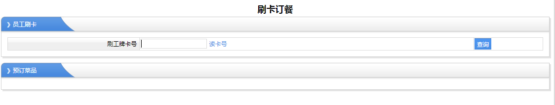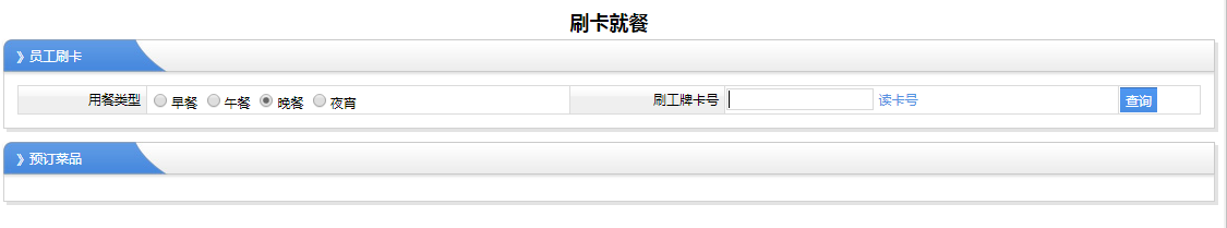 這里主要是哪一天有哪一些菜單的查詢?數(shù)據(jù)來源于菜單計劃設(shè)置的數(shù)據(jù),那么設(shè)置今天去有哪些菜,那么我們在這里就可以看到,然后員工訂餐的時候就有知道該吃什么菜 2、刷卡訂餐 刷卡訂餐,這里操作很簡單,不用在電腦上操作,也不用在手機(jī)上面操作,在我們放刷卡機(jī)的地方,把我們的工卡放在上面滴一下就可以了,如果訂餐成功以后,刷卡訂餐成功后,系統(tǒng)會語音播報,訂餐成功,如果重復(fù)刷卡,那么也會提示重復(fù)刷卡的語音信息,但是不影響把訂餐的效果,也不會重復(fù)訂餐 3、員工訂餐 員工訂餐分兩種情況進(jìn)行訂餐,一種是在電腦上面,通過瀏覽器打開系統(tǒng),直接在電腦上面操作進(jìn)行訂餐,其界面如下圖所示