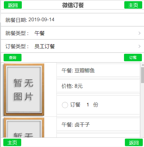 在這里需要注意的是,一天定的早中晚夜宵餐,都可以在這個界面上操作完成,只是我們要看到我們選擇的菜單中的類型,哪些是早餐?哪些是午餐?哪些是晚餐?那么訂餐人員要注意看一下,以免訂漏或者訂錯 另種就是微信訂餐:人工通過手機(jī)微信進(jìn)行訂餐,打開微信訂餐的界面如下  只要我們在這里選擇的餐有哪一些?然后我們點擊訂餐,就完成了,但是需要注意的是,微手機(jī)上操作界面比較小,要注意操作,不要訂錯了! 4、臨時訂餐 員工為臨時來本公司辦事,需要就餐時,由本公司的員工進(jìn)行幫供應(yīng)商進(jìn)行訂餐,由操作跟員工訂餐類似,操作也是很簡單的,如下圖