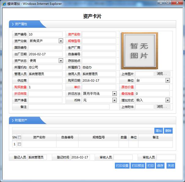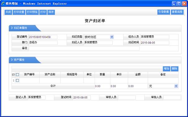 1、基礎(chǔ)設(shè)置 基礎(chǔ)設(shè)置就是對資產(chǎn)所關(guān)聯(lián)的類型的管理。這里操作很簡單,大致介紹一下。 1.1、資產(chǎn)分類 就是把資產(chǎn)分成多個類型,以方便進行查詢及統(tǒng)計分析。 注意:資產(chǎn)分類,大分類會包含小的分類,所以一定要選擇對上級分類。 操作功能:頁面設(shè)置,打印設(shè)置,打印預(yù)覽,打印,增加,修改,刪除,明細,導(dǎo)出EXCEL,導(dǎo)出WORD等功能。 1.2、資產(chǎn)卡片 就是資產(chǎn)的具體信息。以卡片式的管理。 注意: 1、資產(chǎn)有折舊的管理,所以一定要輸入正確的折舊方法及相關(guān)參數(shù),如購買時間,原總價值,折舊年限,折舊方法,最低殘值等。 2、折舊年限:按照多少年進行折舊。主要對應(yīng)的折舊方法的“限月平均法,限年平均法,限日平均法”, 其折舊計算公式: 資產(chǎn)凈值=原總價值-(原總價值/總共折舊時間)*已經(jīng)使用的時間 如“限月平均法”,總共折舊時間=折舊年限*12;已經(jīng)使用的時間=現(xiàn)在時間-購買時間(折算出總共有多少個月)。 3、遞減率法:主要有“每月遞減率,每年遞減率,每日遞減率”,就是按原價的總值進行百分率進行遞減。 其折舊計算公式: 資產(chǎn)凈值=原總價值-原總價值*遞減率*已經(jīng)使用的時間 如“每月遞減率”原總價值-原總價值*每月遞減率*已經(jīng)使用的時間 已經(jīng)使用的時間=現(xiàn)在時間-購買時間 再折算成多少個月。 4、遞減值法:主要有“每月遞減值,每年遞減值,每日遞減值”,就是按固定值進行遞減。 其折舊計算公式: 資產(chǎn)凈值=原總價值-遞減值*已經(jīng)使用的時間 如“每月遞減值”原總價值-每月遞減值*已經(jīng)使用的時間 已經(jīng)使用的時間=現(xiàn)在時間-購買時間 再折算成多少個月。 5、管理人員:主要是該資產(chǎn)是誰負責(zé)進行管理,那自己管理的資產(chǎn)信息,可以在“我的資產(chǎn)”列表中看到。 1.3、借出分類 主要用于資產(chǎn)借出是屬于那種借出進行的分類,以便于進行統(tǒng)計分析。 操作功能:頁面設(shè)置,打印設(shè)置,打印預(yù)覽,打印,增加,修改,刪除,明細,導(dǎo)出EXCEL,導(dǎo)出WORD等功能。 1.4、歸還類型 主要用于資產(chǎn)借出還回的是那種類型,如“按期歸還,越期歸還”等。 操作功能:頁面設(shè)置,打印設(shè)置,打印預(yù)覽,打印,增加,修改,刪除,明細,導(dǎo)出EXCEL,導(dǎo)出WORD等功能。 1.5、終止類型 主要用于資產(chǎn)終止類型,如“銷售出去,人為丟失,愛心損贈”等。 操作功能:頁面設(shè)置,打印設(shè)置,打印預(yù)覽,打印,增加,修改,刪除,明細,導(dǎo)出EXCEL,導(dǎo)出WORD等功能。 2、資產(chǎn)管理 資產(chǎn)管理主要是對公司資產(chǎn)進行的一些變動,借還,還有資產(chǎn)終止等一系列變動過程的管理。 2.1、資產(chǎn)采購 主要是公司需要使用那些資產(chǎn)進行購買后進行的資產(chǎn)登記處理,其添加的記錄可以在“資產(chǎn)采購表”中查詢。還是還可以引用工作流程中的“資產(chǎn)采購申請單” 功能特點:增加資產(chǎn)數(shù)量。 操作功能:頁面設(shè)置,打印設(shè)置,打印預(yù)覽,打印,增加,刪除,明細,導(dǎo)出EXCEL,導(dǎo)出WORD,審核,反審核,審批,反審批等功能。 2.2、資產(chǎn)變動 就是對資產(chǎn)的卡片信息進行修改的操作。 跟資產(chǎn)卡片操作完全類似。 2.3、資產(chǎn)維修 就是對公司資產(chǎn)的有損壞或不正常反正,由供應(yīng)商進行維修服務(wù)的記錄情況等管理。其增加的維修記錄可以在“資產(chǎn)維修表”中查詢。 操作功能:頁面設(shè)置,打印設(shè)置,打印預(yù)覽,打印,增加,刪除,明細,導(dǎo)出EXCEL,導(dǎo)出WORD,審核,反審核,審批,反審批等功能。 2.4、資產(chǎn)借出 由于某種原因要把某些資產(chǎn)進行借出,進行登記記錄進行管理。其增加的記錄在“資產(chǎn)借出表”中查詢。這里有一個資產(chǎn)借還流程,其流程較長如下: