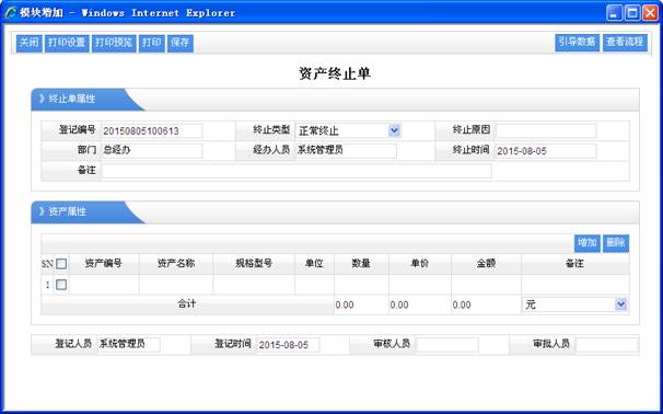 從流程圖看出,此流程也可以引用工作流程的資產(chǎn)借出申請流程。  操作功能:頁面設(shè)置,打印設(shè)置,打印預(yù)覽,打印,增加,刪除,明細,導(dǎo)出EXCEL,導(dǎo)出WORD,審核,反審核,審批,反審批等功能。 2.5、資產(chǎn)歸還 就是資產(chǎn)借出后,進行歸還做的登記管理。其增加為記錄可以在“資產(chǎn)歸還表”中查詢到。  操作功能:頁面設(shè)置,打印設(shè)置,打印預(yù)覽,打印,增加,刪除,明細,導(dǎo)出EXCEL,導(dǎo)出WORD,審核,反審核,審批,反審批等功能。 2.6、資產(chǎn)終止 是因為某種原因而導(dǎo)致該資產(chǎn)不存在了,如丟失,損壞,報廢等。資產(chǎn)終止記錄在“資產(chǎn)終止表”中查詢。其流程先在工作流程中進行“資產(chǎn)終止申請”進行審批后才進行終止,其流程圖如下: