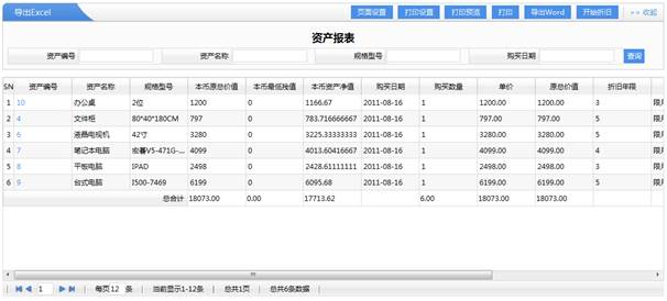 操作功能:頁面設(shè)置,打印設(shè)置,打印預(yù)覽,打印,增加,刪除,明細,導(dǎo)出EXCEL,導(dǎo)出WORD,審核,反審核,審批,反審批等功能。 2.7、資產(chǎn)報表 就是對資產(chǎn)數(shù)量的情況,以及資產(chǎn)折舊后的價值等管理。點擊“開始折舊”則對整個資產(chǎn)進行折舊處理。  操作功能:頁面設(shè)置,打印設(shè)置,打印預(yù)覽,打印,明細,導(dǎo)出EXCEL,導(dǎo)出WORD,開始折舊等功能。