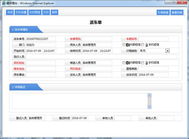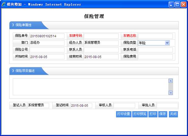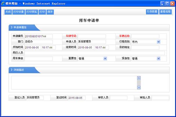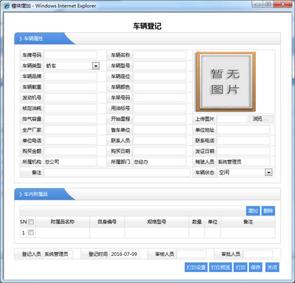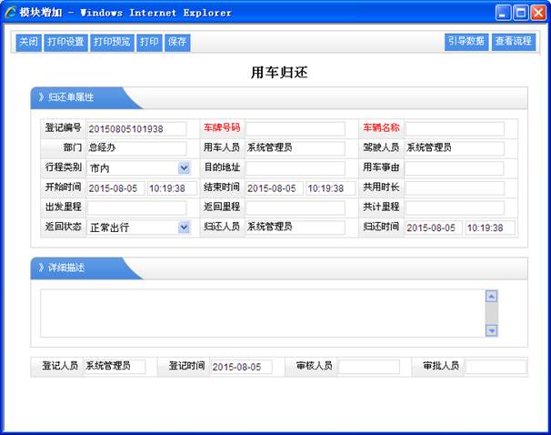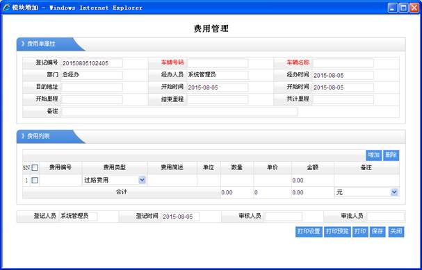 車輛管理軟件主要是對公司行政車輛的管理,主要是針對于公司小轎車,而不是物流公司的運輸車輛的管理,如果要查看物流運輸公司的車輛管理,請查看名易MyTMS物流管理系統(tǒng);主要管理用車申請,派車管理,用完車再還車管理,車輛維修,車輛保養(yǎng),車輛保險,車輛事故等功能模塊的管理,其系統(tǒng)導(dǎo)航圖  1基礎(chǔ)設(shè)置 基礎(chǔ)設(shè)置就是對車輛所關(guān)聯(lián)的類型的管理。這里操作很簡單,大致介紹一下。 1.1、車輛登記 就是對現(xiàn)有的車輛,或購買的車輛進行最基礎(chǔ)的數(shù)據(jù)記錄。其增加的結(jié)果可以要“所有車輛”中查詢到 操作功能:頁面設(shè)置,打印設(shè)置,打印預(yù)覽,打印,增加,刪除,明細,導(dǎo)出EXCEL,導(dǎo)出WORD,審核,反審核,審批,反審批等功能。 1.2、車輛類型 就是對車輛是進行分類處理,如果車輛比較多就可以很好區(qū)分車輛。 操作功能:頁面設(shè)置,打印設(shè)置,打印預(yù)覽,打印,增加,修改,刪除,明細,導(dǎo)出EXCEL,導(dǎo)出WORD等功能。 1.3、費用類型 就是對車輛所產(chǎn)生的有那幾種類型的費用,如“路橋費,洗車費,加油費”等。以方便更好的做好統(tǒng)計分析。 操作功能:頁面設(shè)置,打印設(shè)置,打印預(yù)覽,打印,增加,修改,刪除,明細,導(dǎo)出EXCEL,導(dǎo)出WORD等功能。 1.4、事故類型 車輛可能會發(fā)生事故的類型,如“撞車,撞物,撞人”等。 操作功能:頁面設(shè)置,打印設(shè)置,打印預(yù)覽,打印,增加,修改,刪除,明細,導(dǎo)出EXCEL,導(dǎo)出WORD等功能。 1.5、保險類型 車輛所要參加保險的類型 操作功能:頁面設(shè)置,打印設(shè)置,打印預(yù)覽,打印,增加,修改,刪除,明細,導(dǎo)出EXCEL,導(dǎo)出WORD等功能。 2、車輛管理 車輛管理主要是對公司車輛日常行動進行的管理,如車輛行程,油耗,維修,保險等管理。 用車管理流程: 2.1、用車申請 需要用車的人員進行申請用車,其申請的結(jié)果在“用車申請表”中查詢。  操作功能:頁面設(shè)置,打印設(shè)置,打印預(yù)覽,打印,增加,刪除,明細,導(dǎo)出EXCEL,導(dǎo)出WORD,審核,反審核,審批,反審批等功能。 2.2、派車管理 車輛管理人員對申請用車的情況進行合理的安排用車。其派車情況可以在“派車管理表”中查詢。 操作功能:頁面設(shè)置,打印設(shè)置,打印預(yù)覽,打印,增加,刪除,明細,導(dǎo)出EXCEL,導(dǎo)出WORD,審核,反審核,審批,反審批等功能。 2.3、用車歸還 用車人員用完車后進行把車歸還到車輛管理處,以更合理的安排車輛。歸還情況在“用車歸還表”中查詢。 操作功能:頁面設(shè)置,打印設(shè)置,打印預(yù)覽,打印,增加,刪除,明細,導(dǎo)出EXCEL,導(dǎo)出WORD,審核,反審核,審批,反審批等功能。 2.4、油耗管理 就是對車輛加油的管理,以及每次加油的所行駛的里程等方面的管理。其增加的結(jié)果可以在“油耗管理表”中查詢。  注意:要準確填寫“加油里程,剩余油量,上次加油里程,上次加油后油量”這里會自動計算出共計里程,總共耗油”等。 1、加油里程:是本次加油時的車輛里程表數(shù)值。 2、剩余油量:本次加油時還剩多少油量。 3、上次加油里程:是上一次加油時的車輛里程表數(shù)值。 4、上次加油后油量:是上一次加油后總共油量。 操作功能:頁面設(shè)置,打印設(shè)置,打印預(yù)覽,打印,增加,刪除,明細,導(dǎo)出EXCEL,導(dǎo)出WORD,審核,反審核,審批,反審批等功能。 2.5、車輛送修 有的時候車輛損壞程度比較嚴重,當(dāng)天沒有辦法,只能送去進行維修。其送修記錄可以在“車輛送修表”中查詢。 操作功能:頁面設(shè)置,打印設(shè)置,打印預(yù)覽,打印,增加,刪除,明細,導(dǎo)出EXCEL,導(dǎo)出WORD,審核,反審核,審批,反審批等功能。 2.6、車輛維修 就是正式對車輛進行維修情況的記錄,其維修記錄可以在“車輛維修表”中查詢。 操作功能:頁面設(shè)置,打印設(shè)置,打印預(yù)覽,打印,增加,刪除,明細,導(dǎo)出EXCEL,導(dǎo)出WORD,審核,反審核,審批,反審批等功能。 2.7、車輛保養(yǎng) 就是車輛進行保養(yǎng)登記的管理。以方便了解其車輛的保養(yǎng)情況。其保養(yǎng)的結(jié)果可以在“車輛保養(yǎng)表”中查詢。 操作功能:頁面設(shè)置,打印設(shè)置,打印預(yù)覽,打印,增加,刪除,明細,導(dǎo)出EXCEL,導(dǎo)出WORD,審核,反審核,審批,反審批等功能。 2.8、費用管理 是該車輛所產(chǎn)生一切費用的登記,其登記費用的結(jié)果在“費用管理表”中查詢。 操作功能:頁面設(shè)置,打印設(shè)置,打印預(yù)覽,打印,增加,刪除,明細,導(dǎo)出EXCEL,導(dǎo)出WORD,審核,反審核,審批,反審批等功能。 2.9、保險管理 就是對該車輛參考所有的保險記錄,其增加的結(jié)果可以在“保險管理表”中查詢。  操作功能:頁面設(shè)置,打印設(shè)置,打印預(yù)覽,打印,增加,刪除,明細,導(dǎo)出EXCEL,導(dǎo)出WORD,審核,反審核,審批,反審批等功能。 2.10、事故管理 就是該車輛所發(fā)生的事故進行登記管理,其增加的結(jié)果可以在“事故管理表”中查詢到。 操作功能:頁面設(shè)置,打印設(shè)置,打印預(yù)覽,打印,增加,刪除,明細,導(dǎo)出EXCEL,導(dǎo)出WORD,審核,反審核,審批,反審批等功能。