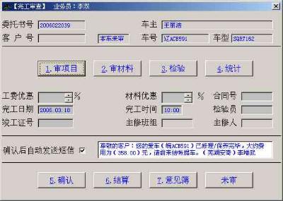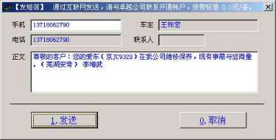 一、 系統(tǒng)功能 隨著手機(jī)的普及,方便、價(jià)廉、快捷、時(shí)尚的手機(jī)短信已成為人們聯(lián)系的一種重要方式。在汽車銷售、汽車維修服務(wù)中短信可以發(fā)揮出重要的作用: 1)、車輛維修過(guò)程中遇到需要與客戶協(xié)商的問(wèn)題時(shí),發(fā)送短信通知客戶; 2)、車輛維修完畢后通知客戶前來(lái)結(jié)賬提車; 3)、提醒客戶做首次保養(yǎng)或者再次保養(yǎng); 4)、在客戶承諾的還款日期到期時(shí)提醒客戶前來(lái)結(jié)賬; 5)、車輛維修后回訪,在其他方式聯(lián)系不上客戶時(shí),可發(fā)短信聯(lián)系; 6)、在客戶生日或者在節(jié)假日發(fā)短信祝賀,加強(qiáng)與客戶的感情交流; 7)、舉辦活動(dòng)時(shí)成批通知客戶; 8)、在銷售系統(tǒng)中,通過(guò)短信做售后跟蹤服務(wù))、如:通知客戶做新車首保); 9)、在俱樂(lè)部系統(tǒng)中,通過(guò)短信告知會(huì)員服務(wù)信息或舉辦活動(dòng)的信息。 二、 系統(tǒng)特點(diǎn) 1)、 操作簡(jiǎn)便,在電腦上用鍵盤(pán)輸入比直接在手機(jī)上輸入快很多。 2)、 車主、手機(jī)號(hào)碼自動(dòng)從汽車管理軟件中取出,固定信息)、如“您的愛(ài)車)、浙A-T0386)已經(jīng)保養(yǎng)完畢,大約費(fèi)用)、291.00)元,請(qǐng)前來(lái)結(jié)帳提車”、單位落款、發(fā)信人等)無(wú)須再輸入,大大提高效率,一般5秒內(nèi)即可發(fā)到用戶手機(jī)上)、具體時(shí)間與移動(dòng)公司網(wǎng)絡(luò)有關(guān))。 3)、 通過(guò)互聯(lián)網(wǎng)發(fā)送,無(wú)需購(gòu)買(mǎi)任何設(shè)備,節(jié)約投資。 4)、 中國(guó)移動(dòng)、中國(guó)聯(lián)通都能發(fā)送。 5)、 費(fèi)用低廉,短信費(fèi)比電話費(fèi)便宜許多。 三、 在汽車管理汽車系列軟件中的應(yīng)用 1、在《汽車管理汽車維修服務(wù)管理系統(tǒng)》中的應(yīng)用: 1)、業(yè)務(wù)接待?增修理項(xiàng):在維修中發(fā)現(xiàn)新的故障或者有事需要與客戶聯(lián)系時(shí),在此處可發(fā)送短信聯(lián)系客戶。 2)、業(yè)務(wù)接待?完工審查:車輛維修完工時(shí),通知客戶前來(lái)結(jié)賬提車。 3)、業(yè)務(wù)接待?一般查詢:需要與客戶聯(lián)系時(shí)可以發(fā)送短信聯(lián)系。 4)、業(yè)務(wù)接待?車輛查詢?新用戶:對(duì)新客戶進(jìn)行回訪時(shí),可發(fā)送短信聯(lián)系。 5)、業(yè)務(wù)接待?其他處理?用戶清單:對(duì)體公司任一客戶或成批客戶可以根據(jù)需要發(fā)送短信聯(lián)系。 6)、業(yè)務(wù)接待?其他處理?其他處理?跟蹤服務(wù):在維修后的跟蹤回訪時(shí)可通過(guò)短信回訪客戶。 7)、業(yè)務(wù)接待?其他處理?銷車檔案:從本公司購(gòu)車的客戶,可以及時(shí)通知客戶前來(lái)做首保。 8)、財(cái)務(wù)結(jié)算?車輛結(jié)算:在車輛完工結(jié)帳時(shí),若有需要可發(fā)短信通知客戶前來(lái)結(jié)賬提車。 9)、財(cái)務(wù)結(jié)算?欠賬處理:在用戶承諾還款日期到期時(shí)提醒客戶前來(lái)還款。 2、在《汽車管理汽車銷售管理系統(tǒng)》中的應(yīng)用: 1)、顧客接待:在這里可以通過(guò)短信做跟進(jìn),促成銷售。 2)、上牌管理:在通過(guò)短信通知客戶有關(guān)上牌事宜。 3)、用戶檔案:如果有事需通知客戶,在這里可通過(guò)短信通知。 3、在《汽車管理汽車俱樂(lè)部管理系統(tǒng)》中的應(yīng)用: 1)、會(huì)員管理:在日常的會(huì)員業(yè)務(wù)管理中,如有會(huì)內(nèi)信息需通知客戶,可發(fā)送短信聯(lián)系。 2)、維修回訪:會(huì)員維修后進(jìn)行回訪時(shí),可發(fā)送短信聯(lián)系。 3)、提醒服務(wù):如有需提醒會(huì)員的事情,如保養(yǎng)、保險(xiǎn)、年檢,可以通過(guò)短信聯(lián)系客戶。 三、 在汽車管理汽車系列軟件中的操作使用方法 1)、針對(duì)單個(gè)客戶的發(fā)送 在汽車管理汽車系列軟件中的操作使用方法非常簡(jiǎn)單?,F(xiàn)以維修系統(tǒng)中完工審查時(shí),通知客戶前來(lái)結(jié)賬提車為例加以說(shuō)明。按回車選中車輛,顯示完工審查畫(huà)面如下:  圖2 在您完工審查完畢,若選中了“確認(rèn)后自動(dòng)發(fā)送短信”,則在您點(diǎn)擊“確認(rèn)”時(shí),系統(tǒng)自動(dòng)發(fā)送一條短信通知客戶前來(lái)結(jié)帳,短信內(nèi)容系統(tǒng)自動(dòng)生成,您也可以自行修改。 車輛維修當(dāng)中遇到需要與客戶協(xié)商的問(wèn)題時(shí),在如下圖的“增修理項(xiàng)”窗口,就有發(fā)送短信功能:  這是發(fā)短信的功能,如果您 的電腦看不到此功能,也可 以直接按S鍵發(fā)送短信。 在窗口的右上角,有“S 短信”功能,按一下“S”鍵,出現(xiàn)如下圖畫(huà)面:  圖 4 系統(tǒng)已自動(dòng)生成短信內(nèi)容。若需要修改短信內(nèi)容,直接在“正文”框中輸入即可。點(diǎn)擊“發(fā)送”即可將短信發(fā)送給客戶,出現(xiàn)如下提示:  圖 5 2)、成批發(fā)送 在圖4中用鼠標(biāo)右鍵點(diǎn)擊“發(fā)送”即可成批發(fā)送。 其他各處的“短信”功能操作方法與此類似,在此不再詳述。 四、 短信系統(tǒng)的試用與購(gòu)買(mǎi) 1、系統(tǒng)升級(jí) 如果您是在2006年3月14日之前安裝的汽車管理汽修系統(tǒng),請(qǐng)重新下載安裝一次《汽車管理軟件支持系統(tǒng)》,再通過(guò)
