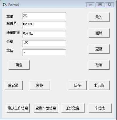 摘 要 本系統(tǒng)的主要功能是洗車(chē)房信息的管理及對(duì)各種信息的查詢,增加,修改,更新。本系統(tǒng)的數(shù)據(jù)庫(kù)是用SQL server 2008軟件進(jìn)行創(chuàng)建與設(shè)計(jì),分別包括車(chē)輛信息,車(chē)位信息,工資信息和密碼表四個(gè)表。通過(guò)系統(tǒng)ODBC數(shù)據(jù)源管理工具把已創(chuàng)建的數(shù)據(jù)源與系統(tǒng)數(shù)據(jù)庫(kù)相連。利用VB軟件對(duì)系統(tǒng)的窗口進(jìn)行設(shè)計(jì),包括歡迎界面、登陸界面、主菜單界面、瀏覽窗體和查詢窗體等,可以通過(guò)這些窗體進(jìn)行登陸操作,對(duì)輸入的用戶信息進(jìn)行驗(yàn)證,以及最重要的操作是對(duì)數(shù)據(jù)庫(kù)中信息進(jìn)行瀏覽與查詢。并可以對(duì)數(shù)據(jù)進(jìn)行添加與刪除,做到及時(shí)更新。 第1章 系統(tǒng)功能概述 1.1 系統(tǒng)功能 (1)(洗車(chē)記錄的管理與查詢 (2)(車(chē)位信息的管理與查詢 (3)(工資信息的管理與查詢 (4)(工作信息修改 1.2 系統(tǒng)結(jié)構(gòu)總圖 洗車(chē)房管理系統(tǒng)通過(guò)運(yùn)用VB軟件建立,窗口化設(shè)計(jì),對(duì)洗車(chē)房各項(xiàng)工作的查詢,管理,更新。記錄日常工作信息,合理分配工資,及時(shí)查詢工作記錄等 第2章 數(shù)據(jù)庫(kù)設(shè)計(jì) 2.1 需求分析 洗車(chē)房的業(yè)務(wù)很簡(jiǎn)單。來(lái)了一輛車(chē),記錄其車(chē)型、車(chē)牌號(hào)、洗車(chē)時(shí)間、價(jià)格,在那個(gè)車(chē)位洗車(chē)。每個(gè)車(chē)位包含若干洗車(chē)員,一輛車(chē)由多個(gè)洗車(chē)員同時(shí)清洗。洗車(chē)數(shù)量、車(chē)型與洗車(chē)員的工資掛鉤,所以必須準(zhǔn)確計(jì)算每個(gè)洗車(chē)員洗車(chē)的次數(shù)和車(chē)型。必須提供復(fù)雜的查詢功能, 2.2 E-R模型 2.3 關(guān)系模型 一個(gè)實(shí)體型轉(zhuǎn)換為一個(gè)關(guān)系模式。實(shí)體的屬性就是關(guān)系的屬性,實(shí)體的碼就是關(guān)系的碼。根據(jù)E-R圖向關(guān)系模型轉(zhuǎn)換的原則,把E-R圖轉(zhuǎn)換為關(guān)系模型。關(guān)系的碼用下橫線標(biāo)出。 (1)車(chē)輛信息(車(chē)牌號(hào)、車(chē)型信息、洗車(chē)時(shí)間、洗車(chē)價(jià)格、車(chē)位) (2)車(chē)位信息(車(chē)位、洗車(chē)員1、洗車(chē)員2、洗車(chē)員3) (3)工資信息(洗車(chē)員號(hào)碼,工資,總車(chē)輛數(shù),大車(chē)數(shù)量,中車(chē)數(shù)量,小車(chē)數(shù)量) (4)密碼表(賬號(hào)、密碼) 2.4 表結(jié)構(gòu)設(shè)計(jì) 本系統(tǒng)需在SQL Server中建立四個(gè)表,分別為車(chē)輛信息,車(chē)位信息,工資信息和密碼表。 (1)洗車(chē)記錄表的建立與基本數(shù)據(jù): “洗車(chē)記錄表”如圖2.5,SQL 語(yǔ)句如下: create table 洗車(chē)記錄 (車(chē)牌號(hào) char(10) PRIMARY KEY, 車(chē)型 char(10) not null, 洗車(chē)時(shí)間 char(10) not null, 價(jià)格 char(10)not null, 車(chē)位 smallint not null,) ;   圖2.5洗車(chē)記錄表 (2)車(chē)位信息表的建立與基本數(shù)據(jù): “車(chē)位信息表”如圖2.6,SQL 語(yǔ)句如下: create table 車(chē)位信息 (車(chē)位 smallint primary key, 洗車(chē)員1 char(10), 洗車(chē)員2 char(10), 洗車(chē)員3 char(10), );  圖2.6車(chē)位信息表 (3)工資信息表的建立與基本數(shù)據(jù): “工資信息表”如2.7,SQL 語(yǔ)句如下: create table 工資信息 (洗車(chē)員char(10) primary key, 工資 char(10), 數(shù)量 char(10), 大 char(10), 中 char(10), 小 char(10), );  圖2.7工資信息表 (4)系統(tǒng)信息表的建立與基本數(shù)據(jù): “密碼表”如圖2.8,SQL語(yǔ)句如下: Create table 密碼表 (賬號(hào) varchar(10), 密碼 varchar(10));  圖2.8密碼表 第3章 系統(tǒng)各功能模塊的詳細(xì)設(shè)計(jì) 3.1各窗體的設(shè)計(jì) 本洗車(chē)房管理系統(tǒng)共包括11個(gè)窗體,分別為歡迎界面,登錄,注冊(cè)新用戶,車(chē)型信息查詢,車(chē)位信息查詢,工資信息查詢,車(chē)型信息修改,查詢車(chē)牌號(hào),MDI窗體。其中主窗體為MDI窗體。 下面介紹各個(gè)窗體的設(shè)計(jì)語(yǔ)句及實(shí)現(xiàn)功能。 3.2 封面 封面,如圖3.1,標(biāo)題為“洗車(chē)房管理系統(tǒng)”,為此標(biāo)題添加一個(gè)Timer,編輯代碼使其可以定時(shí)變色。點(diǎn)擊“點(diǎn)擊進(jìn)入系統(tǒng)”就可以關(guān)閉本窗體并打開(kāi)登錄窗體。 封面代碼如下: Private Sub Picture1_Click() Form2.Show Unload Me End Sub 3.3登錄窗體 單擊封面,進(jìn)入登錄窗口,如圖3.2,若正確則打開(kāi)下面的主窗體,如圖3.3。登錄代碼 如下: Dim miCount As Integer Private Sub CmdCancel_Click() Unload Me Private Sub CmdLand_Click() Static miCount As Integer Dim sqlstr As String sqlstr = "Select * from 密碼表 Where 賬號(hào)='" & Text1 & "'" Adodc1.RecordSource = sqlstr Adodc1.Refresh If Adodc1.Recordset.BOF Then MsgBox "賬號(hào)錯(cuò)誤,請(qǐng)重新輸入 ", vbExclamation, "警告" Text1.Text = "": Text1.SetFocus Else If Adodc1.Recordset.Fields("密碼") = Text2.Text Then MDIForm1.Show Unload Me Else MsgBox "密碼錯(cuò)誤,請(qǐng)重新輸入 ", vbExclamation, "警告" Text2.Text = "": Text2.SetFocus End If End If miCount = miCount + 1 If miCount = 3 Then Unload Me End Sub  圖3.2登錄圖 3.4 主菜單 設(shè)計(jì)為MDI窗體如圖3.3,含有主菜單:[菜單](包括洗車(chē)記錄)、[文件](包括洗車(chē)員工作記錄)。 [代碼如下: Priv